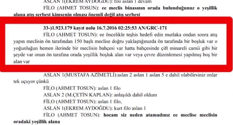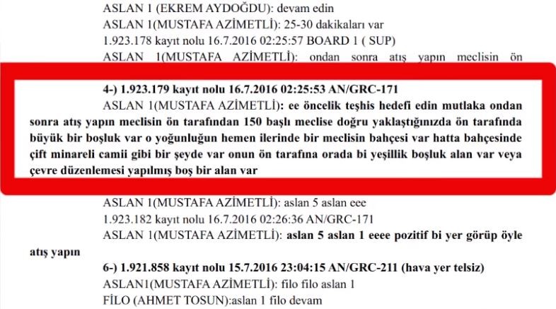 “İlgili dosya Ankara’da meclisin bombalanması ve telsiz konuşmalarını yapanlar da Mustafa Azimetli ve Ahmet Tosun. Mustafa Azimetli meclisi bombalamak ve örgüt yöneticiliğinden birkaç kez müebbet hapis cezası aldı…Şimdi size 2 telsiz konuşması daha vereceğim, biri mütalaanın 434., diğeri de 486. sayfalarında. Birincisi yerden hedef belirleyen Ahmet Tosun, diğeri de havada olması gereken Mustafa Azimetli: