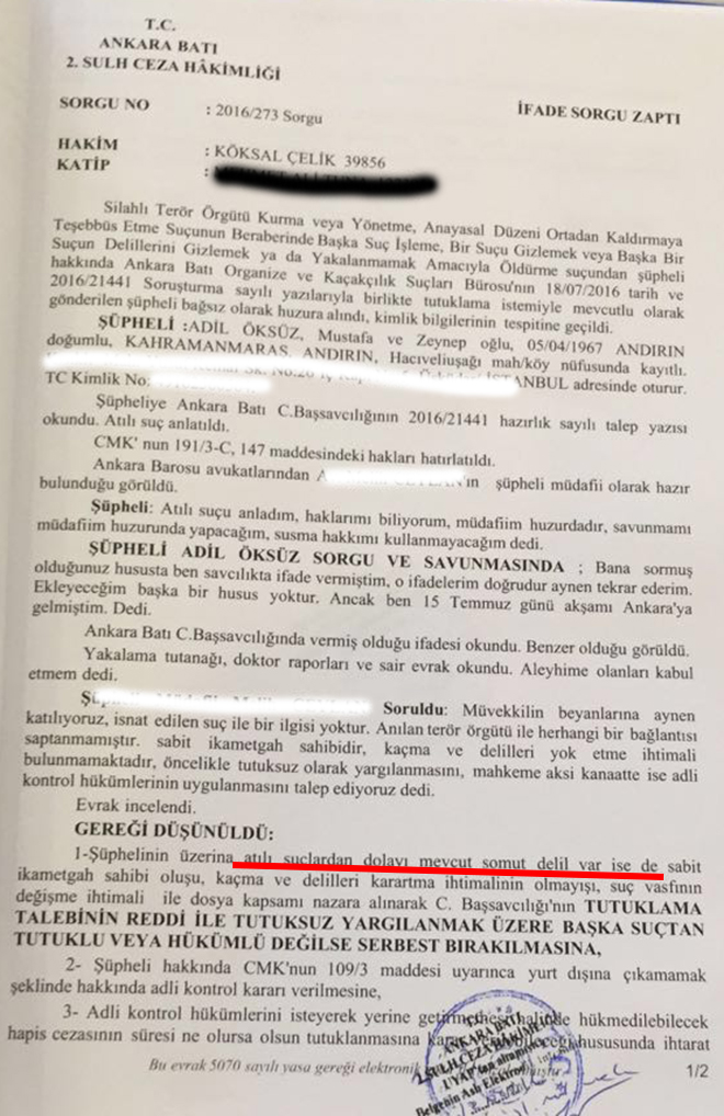 İŞTE HAKİM KÖKSAL ÇELİK’İN ADİL ÖKSÜZ’Ü SERBEST BIRAKTIĞI İFADE SORGU ZAPTI