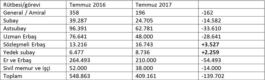 15 Temmuz darbe girişimi sonrası, ordudan ihraç edilen, açığa alınan ve kendiliğinden emekli olanlarla birlikte Türk Silahlı Kuvvetleri (TSK) personel sayısında ciddi bir düşüş yaşandı. TSK’nin subay ve astsubay sayısında yüzde 35’lik bir azalma var. Toplam muvazzaf asker sayısında ise eksilme yüzde otuz üç düzeyinde.